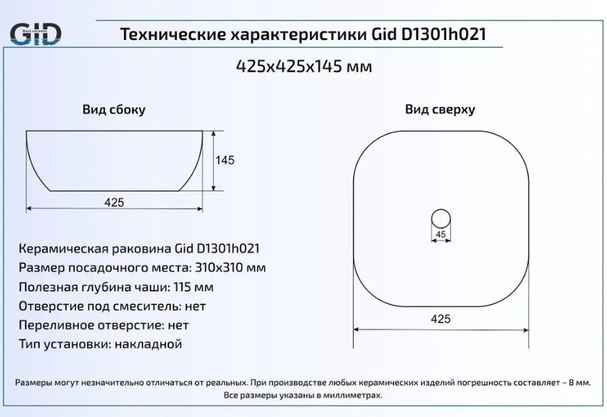 Умывальник Накладная раковина Gid D1301h021 42.5х42.5 белая с хромом 53302