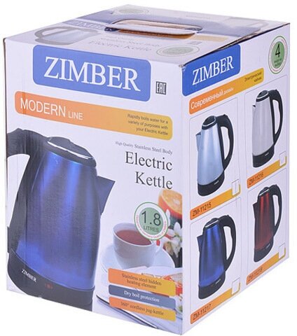 Лучшие цены. Быстро вскипятить воду и поддерживать ее горячей в течение долгого времени Вам поможет чайник ZIMBER. На рынке бытовой техники этот прибор пользуется неизменной популярностью благодаря высокому качеству, безопасности и удобству в использовании. Чайник оснащен скрытым нагревательным элементом, что очень удобно – он более долговечен, чем спираль, и не подвержен образованию накипи. Чайник имеет световую индикацию включения и возможность вращения на базе на 360 градусов. Магазины в вашем городе.