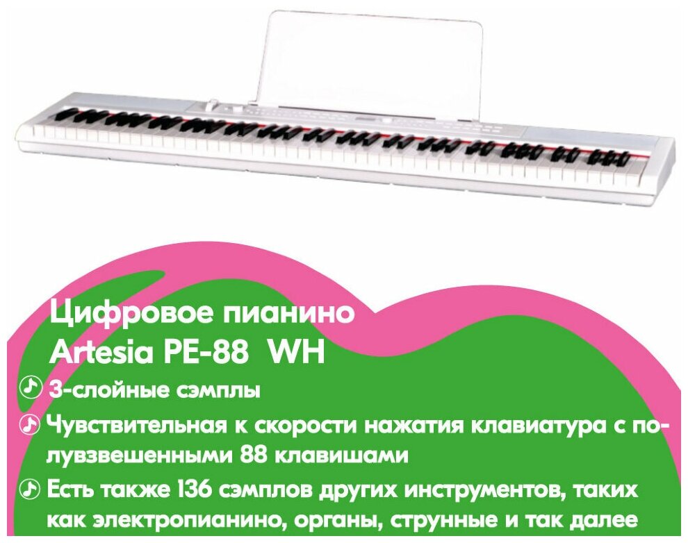 Цифровое пианино Artesia PE-88 White, 88 клавиш, 137 тембров, 64 полифония