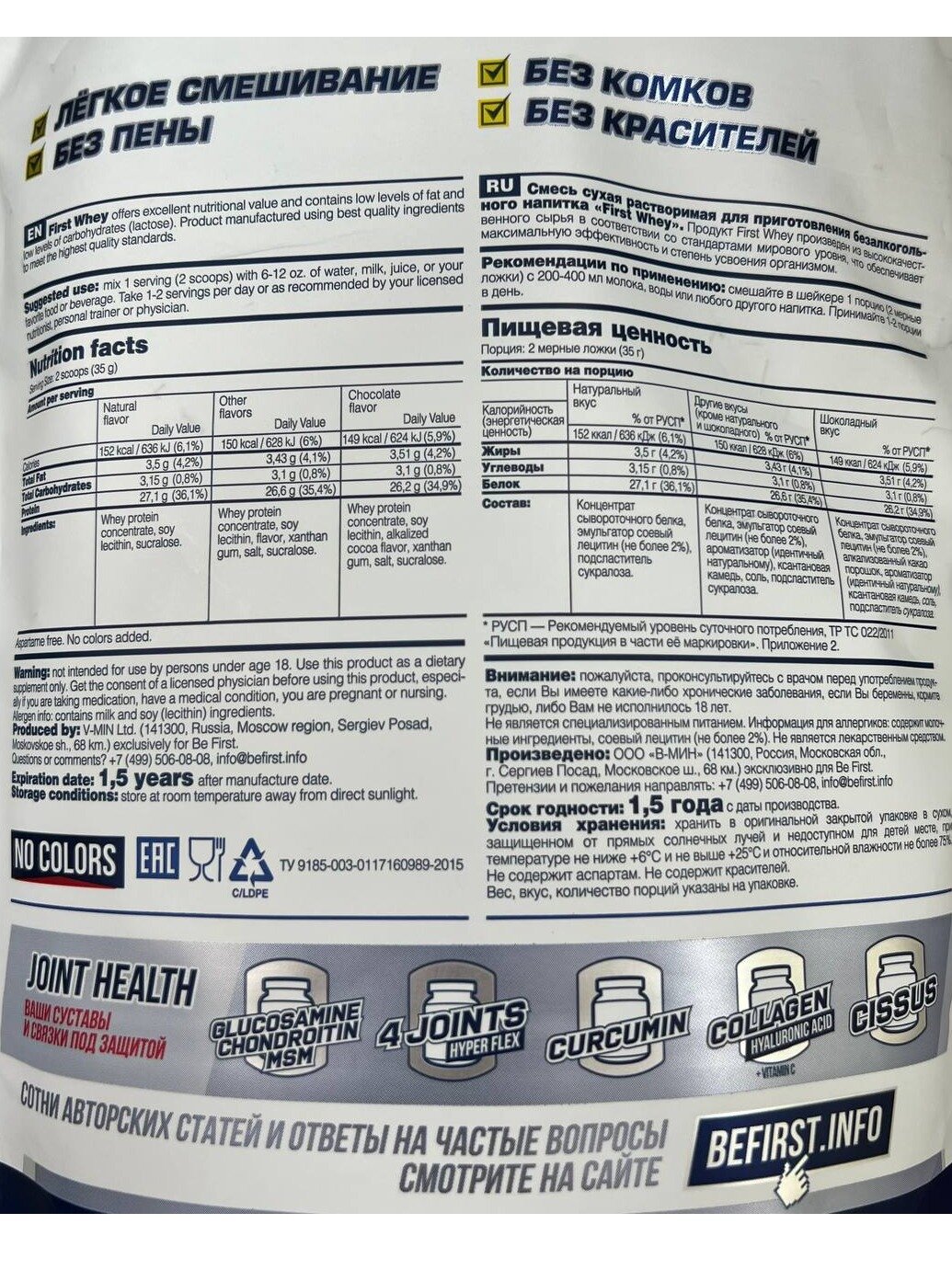 Протеины Сывороточный протеин Be First First Whey Instant (сывороточный протеин) 900 г, Натуральный