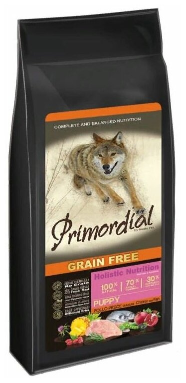 Сухой корм для щенков Primordial беззерновой, курица, рыба 12 кг