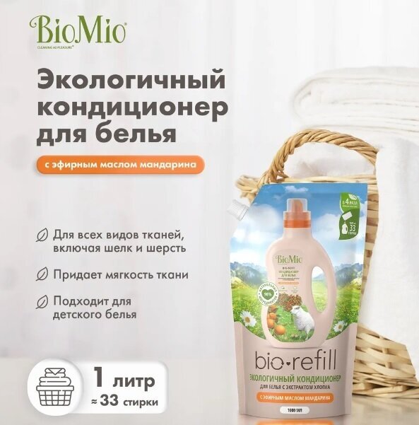 Лучшие цены. Подходит для всех видов тканей, включая шерсть и шелк. С натуральным эфирным маслом Мандарина. Придает мягкость белью после стирки. Облегчает глажение белья и обладает антистатическим эффектом Экономичный расход. Идеально подходит для стирки детского белья и одежды людей с чувствительной кожей. Уменьшает образование заломов во время стирки. Безопасно для планеты. BioMio – линейка эффективных средств для дома, использование которых приносит только удовольствие. Магазины в вашем городе.