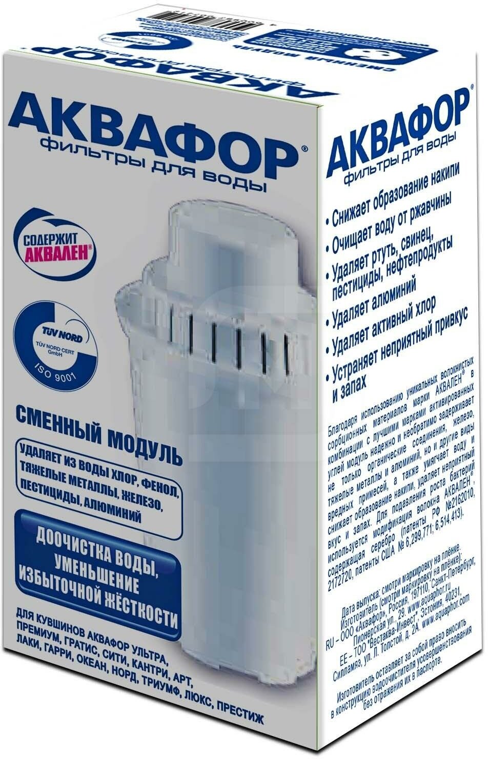 Лучшие цены. Модуль В100-5 содержит в оптимальном соотношении гранулы кокосового угля, ионообменные смолы и «ноу-хау» «Аквафор» — волокна Аквален, которые, подобно корням в почве, пронизывают картридж и фиксируют содержащиеся в нём фильтрующие элементы. В результате такой поддержки создается особая пространственная структура, благодаря которой фильтр работает быстрее и эффективнее. Благодаря Аквалену модуль В100-5 очищает воду всем объемом, без застойных зон и канальных эффектов. Магазины в вашем городе.
