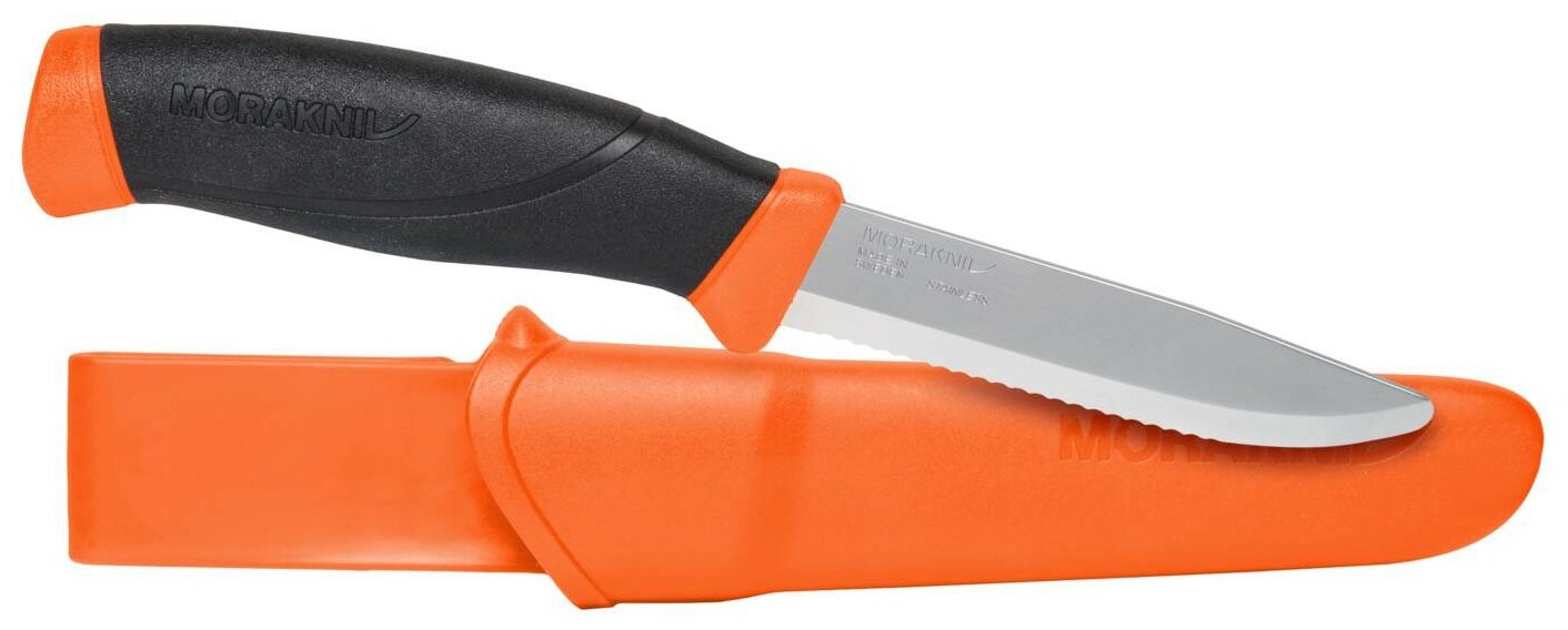 Нож туристический Morakniv Companion F серрейтор, нержавеющая сталь, прорезиненная рукоять с оранжевыми накладкам