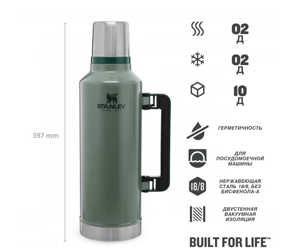 Лучшие цены. Темно-зеленый термос STANLEY Classic 2,3L удерживает тепло в течении 48 часов, а вот напитки со льдом останутся холодными в течении 240 часов. Отличительные особенности: Герметичен, с вакуумной изоляцией. Корпус и внутренняя колба - из нержавеющей стали 18/8. Дно тоньше. Матовое порошковое покрытие. Крышка - термостакан c желобками. Прочная складная пластиковая ручка. Для посудомоечной машины. Магазины в вашем городе.