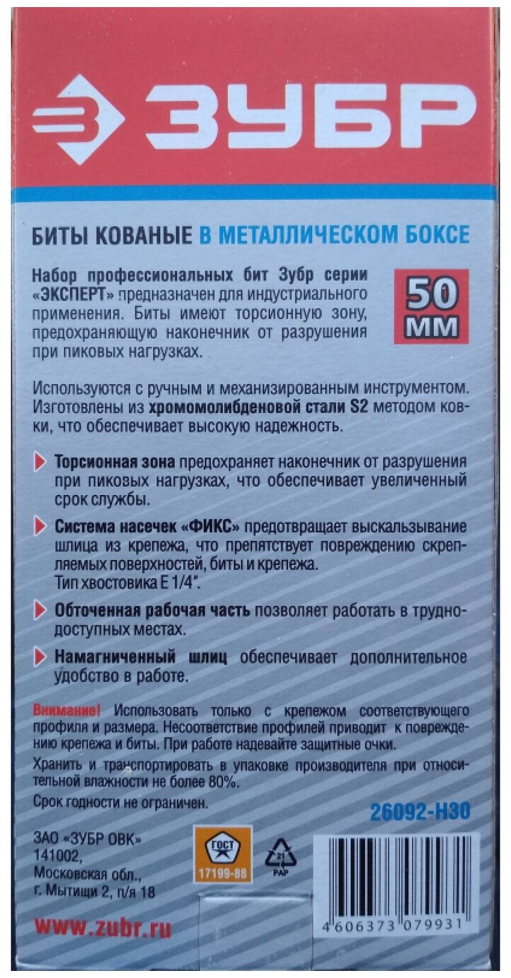 Лучшие цены. Набор бит ЗУБР 26092-H30, предназначен для слесарных, монтажных и ремонтных работ. Биты имеют торсионную зону, предохраняющую наконечник от разрушения при пиковых нагрузках. Торсионная зона предохраняет наконечник от разрушения при пиковых нагрузках, что обеспечивает увеличенный срок службы. Система насечек «фикс» предотвращает выскальзывание шлица из крепежа, что препятствует повреждению скрепляемых поверхностей, биты и крепежа. Тип хвостовика E 1/4". Магазины в вашем городе.