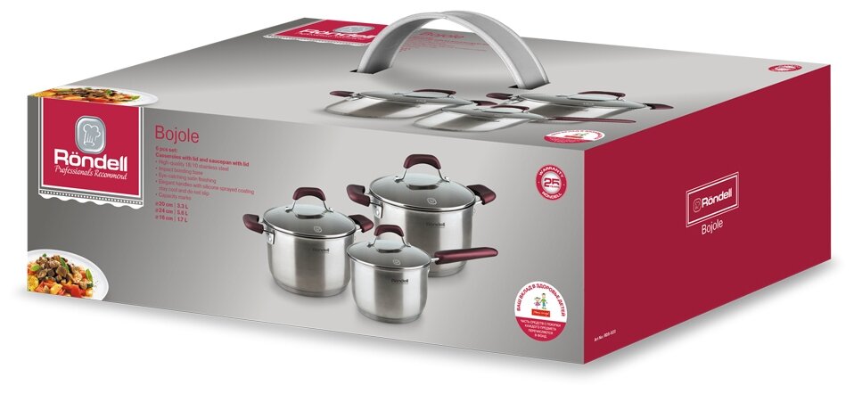 Лучшие цены. Набор посуды Rondell "Bojole" состоит из двух кастрюль с крышками и ковша с крышкой. Изделия изготовлены из высококачественной нержавеющей стали. Комбинированная зеркальная и матовая полировка придает посуде безупречный внешний вид, делает ее долговечной и практичной. Уникальный двухэтапный метод технологии тройного дна с вштампованным, а затем вплавленным алюминиевым диском позволяет равномерно распределять и значительно дольше сохранять тепло по стенкам и дну посуды, что предотвращает пригорание. Магазины в вашем городе.