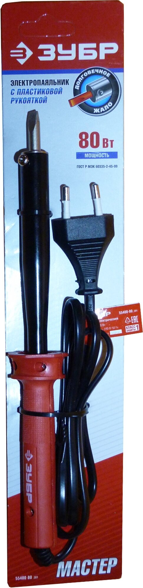 Электропаяльник с пластмассовой рукояткой и долговечным жалом, форма клин, 80Вт Зубр мастер 55400-80_z01