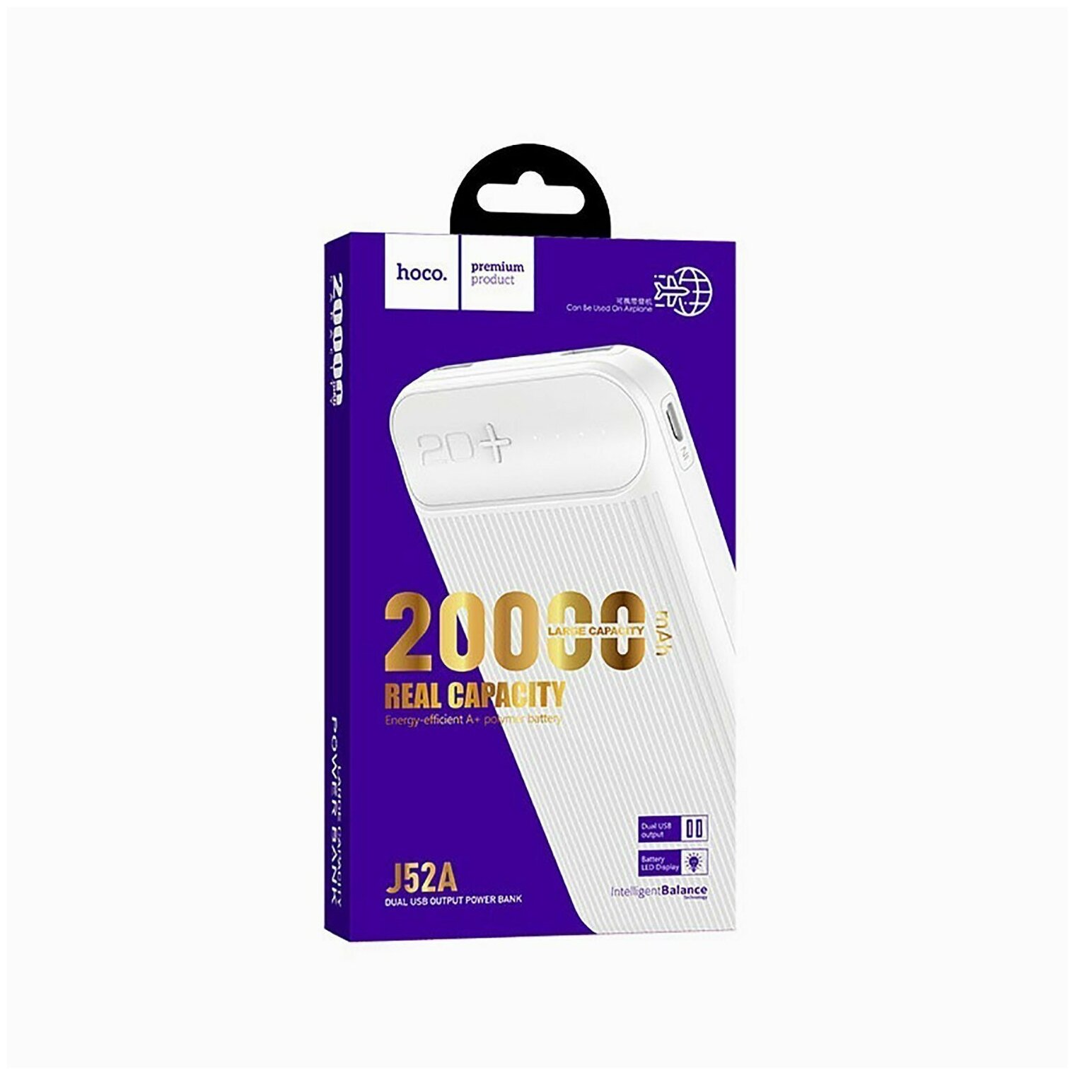 Портативный аккумулятор HOCO J52A, 20000mAh, пластик, 2 USB выхода, индикатор, 2.0A, цвет: белый