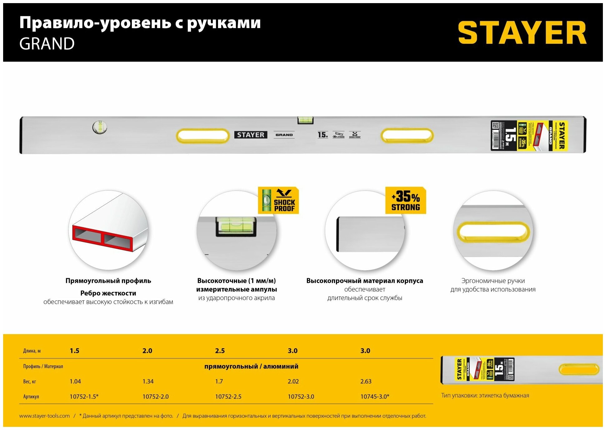 Лучшие цены. Правило-уровень с ручками STAYER Grand 3.0 м 10752-3.0 является профессиональным инструментом высокой точности для работ по выравниваю строительных смесей, а также определению отклонений поверхности от горизонтали или вертикали. Изделие отличается повышенной прочностью и устойчивостью к сгибанию и кручению профиля за счет дополнительного ребра жесткости. Преимущества Высокопрочные акриловые глазки; Большая длина; По краям инструмента расположены заглушки; Жесткая конструкция; Высокая надежность. Магазины в вашем городе.