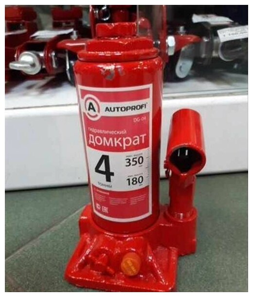 Лучшие цены. Домкрат бутылочный AUTOPROFI, гидравлический, 4 тонны, защита от перегруза, высота подъёма 180 - 350 мм. Автомобильный гидравлический домкрат с рабочей высотой до 350 мм. В сложенном состоянии занимает всего 180 мм по высоте. Максимальный груз — 4 тонны. Встроенная защита от перегруза. Перепускной клапан допускает перегрузку на 25%, но препятствует использованию домкрата при недопустимой нагрузке. Бутылочный домкрат предназначен для работы на твердой и ровной поверхности. Магазины в вашем городе.