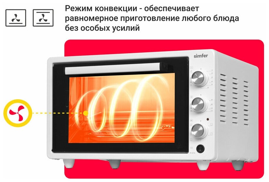 Лучшие цены. Ростер Simfer M4216 представляет собой универсальную и многофункциональную электрическую мини-печь. Она выпускается в серии Albeni Plus и отличается несколькими ключевыми достоинствами. Первое и основное – шесть рабочих режимов, в число которых входят: верхний нагрев; нижний нагрев; комбинированный нагрев (верхний и нижний); вертел; нижний нагрев с конвекцией; комбинированный нагрев с конвекцией. Первые два лучше подходят для подогрева пищи. Третий позволяет приготовить практически любое блюдо. Магазины в вашем городе.