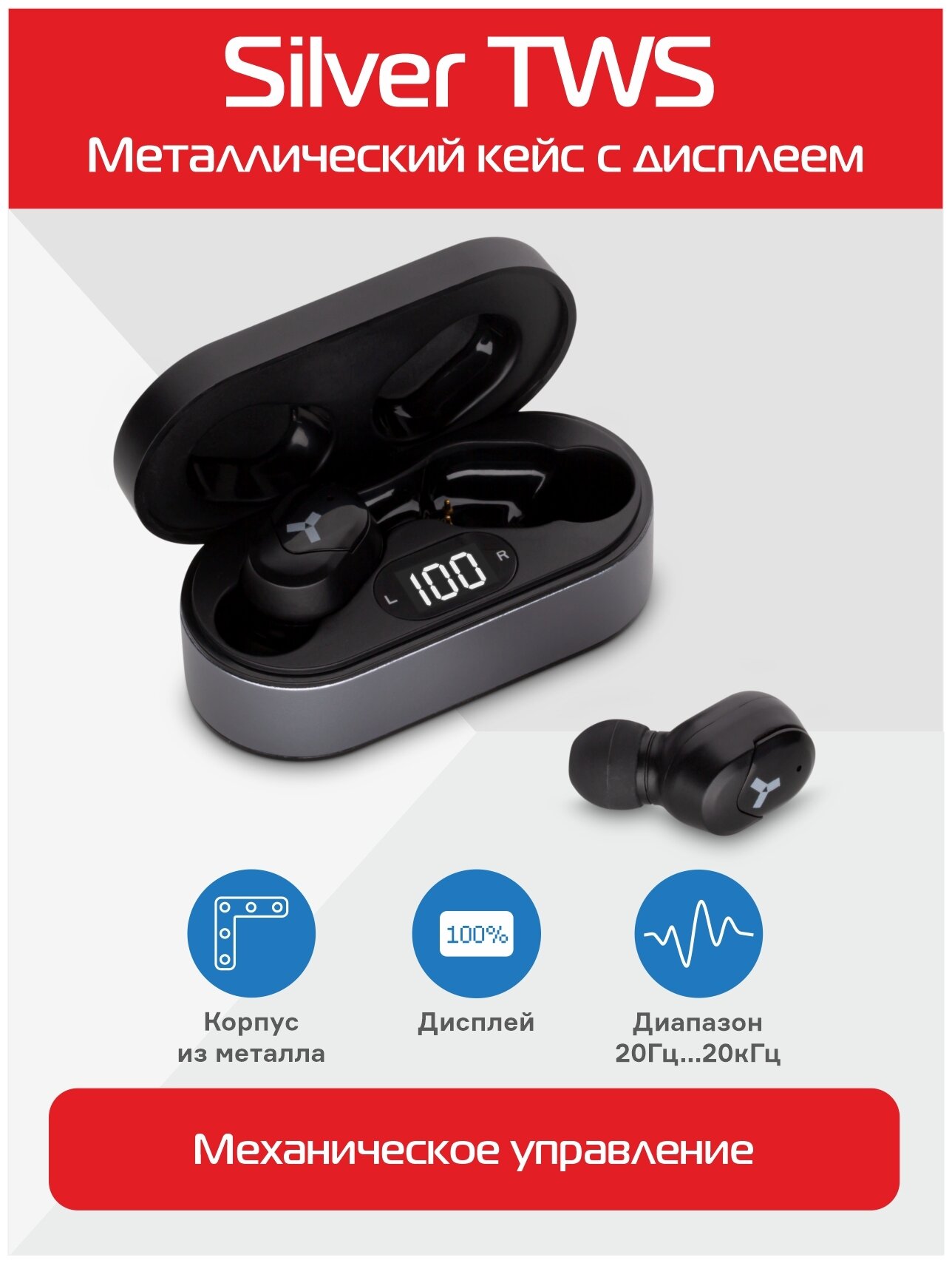 Лучшие цены. Стильные TWS-наушники в компактном металлическом кейсе с дисплеем, показывающим остаток заряда кейса. Кейс сделан из прочного металла, защищающего корпус от любых следов эксплуатации. При своей прочности кейс имеет очень небольшие габариты: менее 7 см в длину и всего 33 грамма. Без проблем помещается в кармане. С одного заряда Silver TWS работают 4 часа. Зарядка наушников составляет 2 часа. 100% заряда кейса хватает на 3 полноценные зарядки наушников. Магазины в вашем городе.
