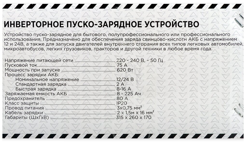 | Емкость заряжаемого аккумулятора | 9 – 190 Ач |