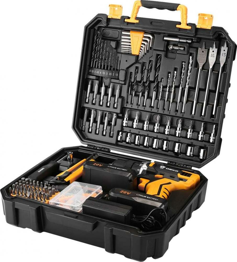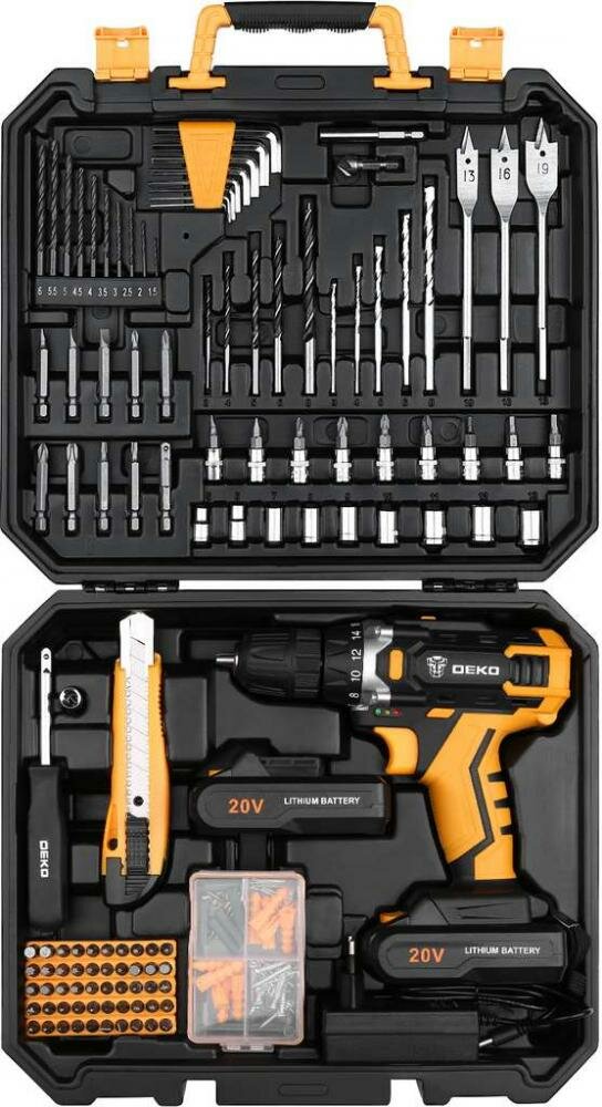 Дрель-шуруповерт аккумуляторная DEKO DKCD20FU-Li 2*20В 2Ач Li-Ion, набор инструментов 193 предмета