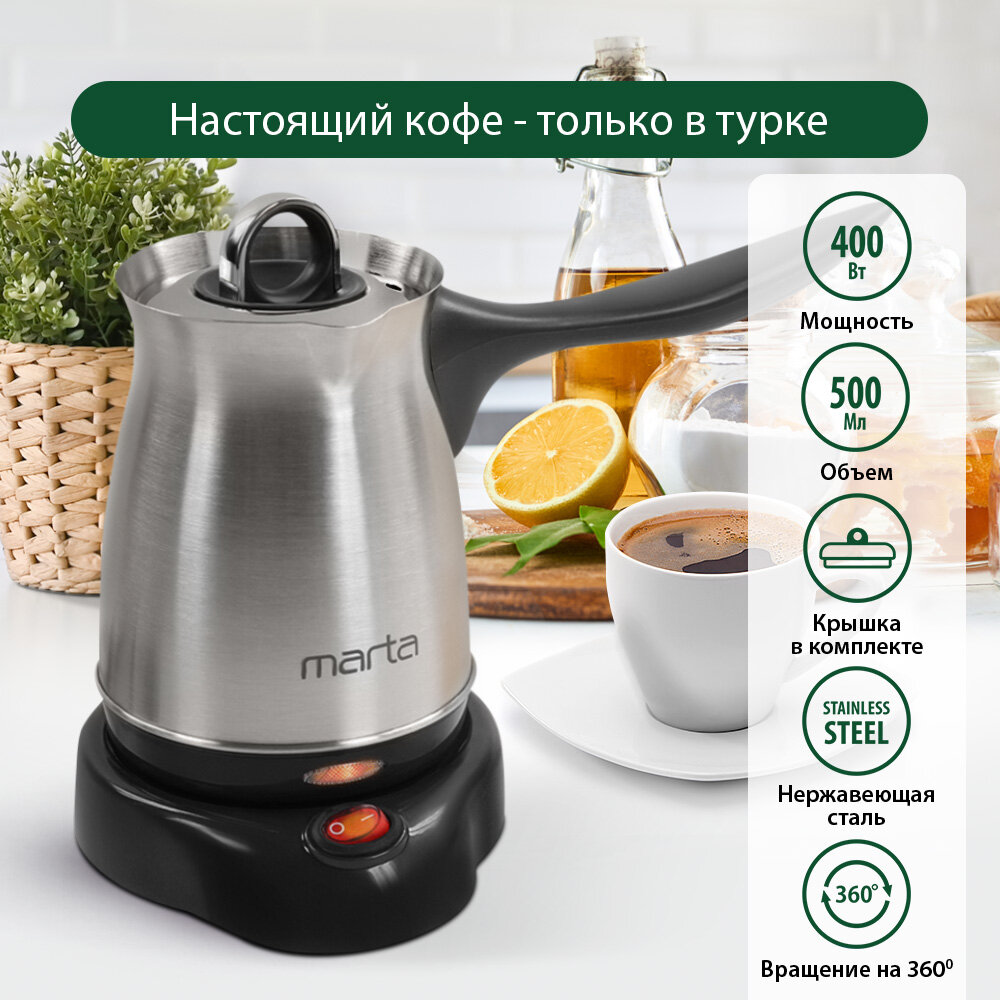 Лучшие цены. Мощность 400 Вт Объем 0.5 л Напряжение 230 Вольт, 50 Герц Материал корпуса нержавеющая сталь/пищевой пластик Тип управления механическое Подсветка да Тип турки турка электрическая Тип нагревательного элемента закрытая спираль Покрытие нагревательного элемента нержавеющая сталь Тип стали нагревательного элемента 201 Автоотключение при недостаточном количестве воды да Автоотключение при закипании нет Теплоизоляционная ручка да Кнопка включения да Вращение на 360 градусов да Материал колбы нержавеющая сталь. Магазины в вашем городе.