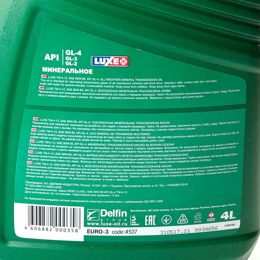 Масло Luxe 80W85 Gl-4 Полусинтетика 4 Л Delfin Group арт. 537