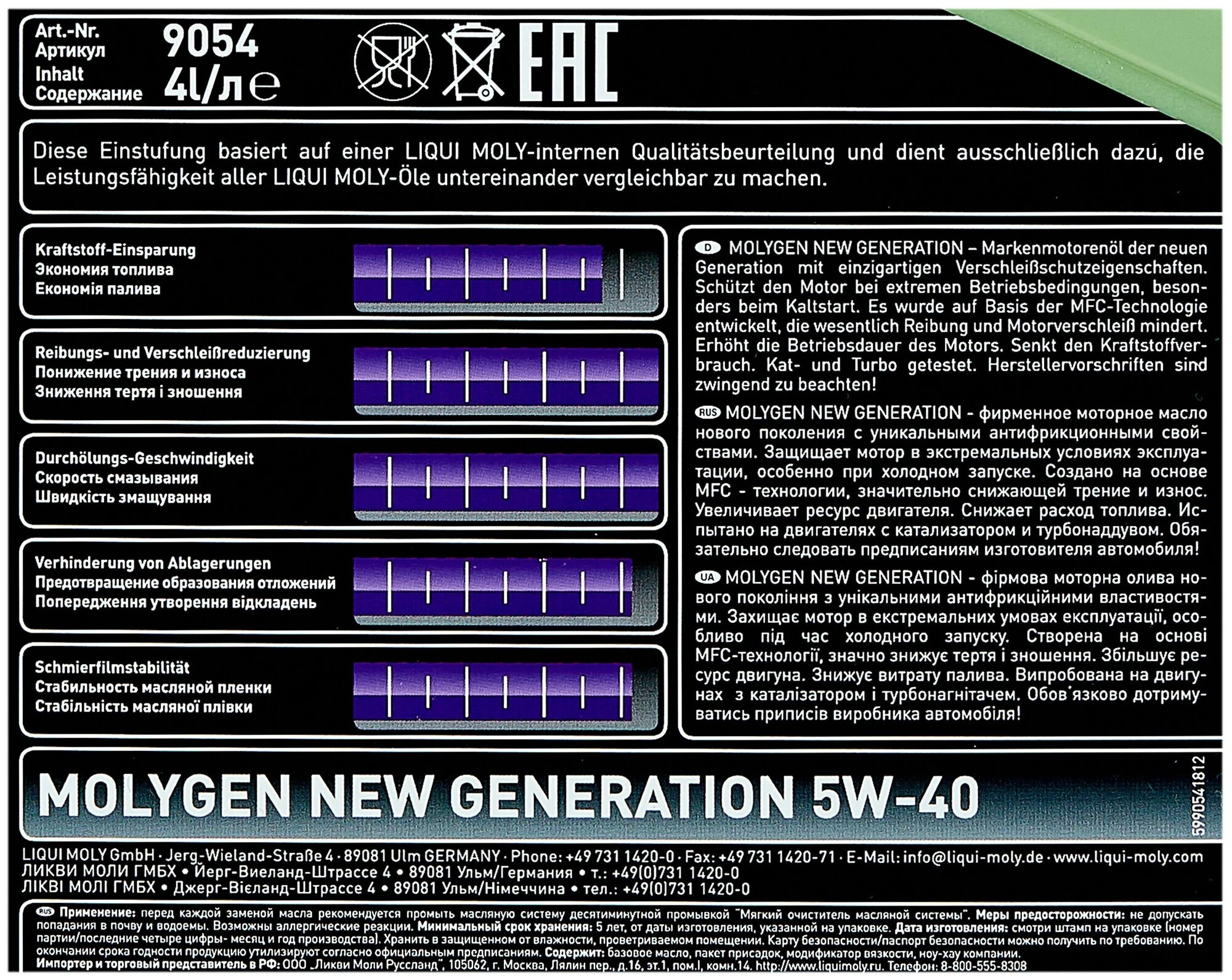 Лучшие цены. Масло моторное 5W-40 MOLYGEN NEW GENERATION 4 л LIQUI MOLY 9054 - Моторное масло на базе HC-синтетической технологии с фирменным антифрикционным пакетом присадок Molygen, созданным на основе новейшей технологии Molecular Friction Control. Оптимально для автомобилей европейского и российского рынка. Экономит до 3,5% топлива и существенно продлевает ресурс двигателя. Моторное масло удовлетворяет современным спецификациям API/ACEA. Магазины в вашем городе.