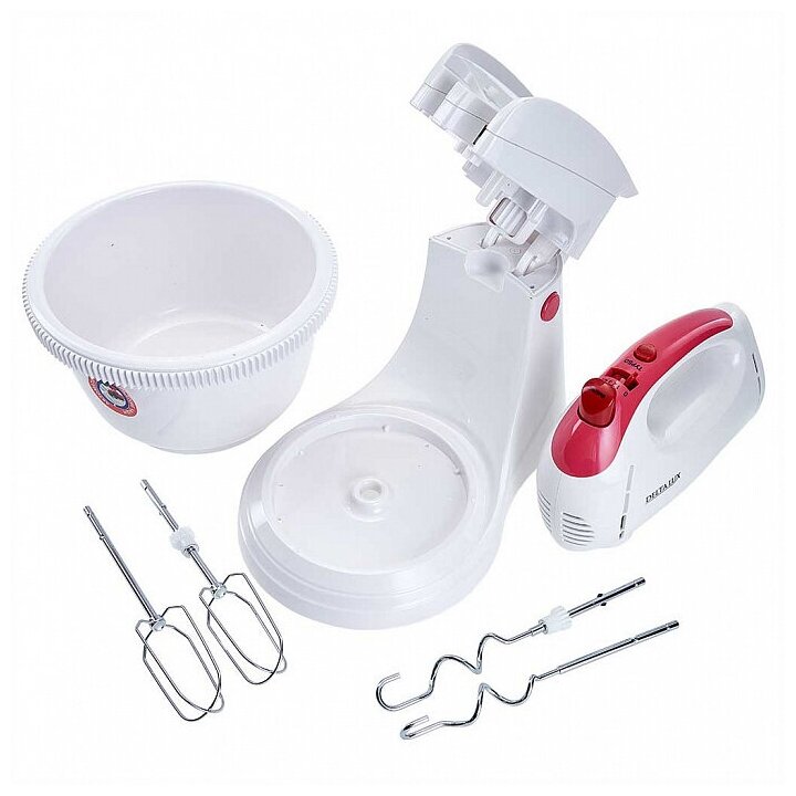 Лучшие цены. Миксер DELTA LUX DL-5071C – это стационарный прибор, выполненный в белом корпусе с розовыми вставками. Это функциональный прибор, который идеально справляется со смешиванием сыпучих и жидких продуктов, приготовлением десертов и соусов, а также позволяет замешивать тесто. Для этого модель предусматривает в комплекте четыре насадки: два венчика для взбивания яиц и крема и две насадки для замешивания теста. Магазины в вашем городе.