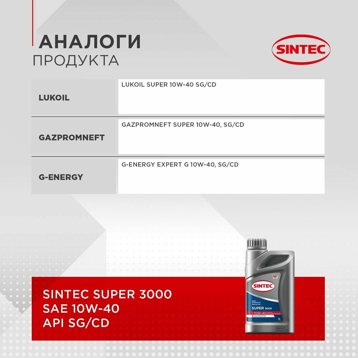 Лучшие цены. Полусинтетическое моторное масло SINTEC супер 10W-40 производится с использованием высокоочищенных базовых масел и сбалансированного пакета присадок. Предназначено для применения в бензиновых и дизельных двигателях современных легковых и грузовых автомобилей отечественного и зарубежного производства. Обладает увеличенным сроком службы, сниженным расходом масла на «угар» и улучшенными антикоррозионными свойствами. Магазины в вашем городе.