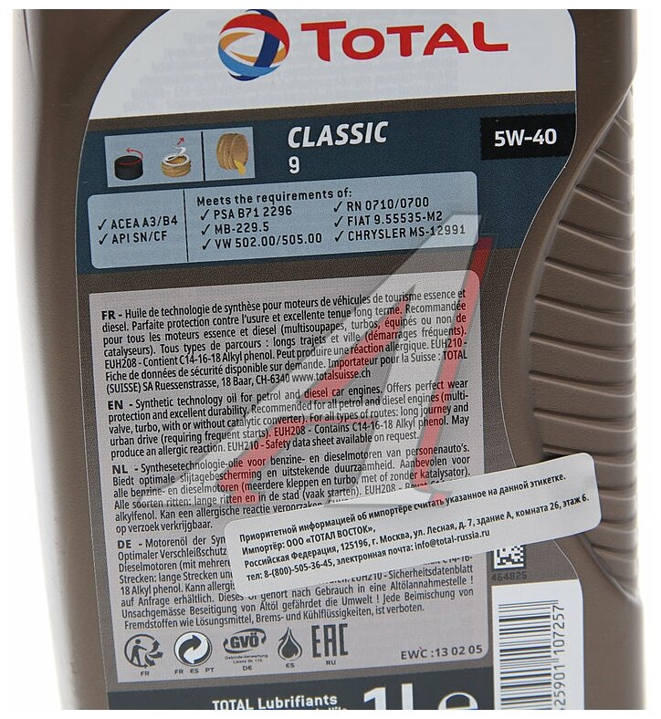 Лучшие цены. Масло TOTAL CLASSIC 9 5W40, изготовленное с применением синтетических технологий, рекомендуется для бензиновых двигателей (мультиклапанные, турбированные, оснащенные каталитическим нейтрализатором) и дизельных двигателей (турбированных или атмосферных) легковых автомобилей и фургонов. Масло моторное Total Масло моторное Total Масло производится на основе пакета высокоэффективных присадок для выполнения требований спецификации ACEA. Магазины в вашем городе.