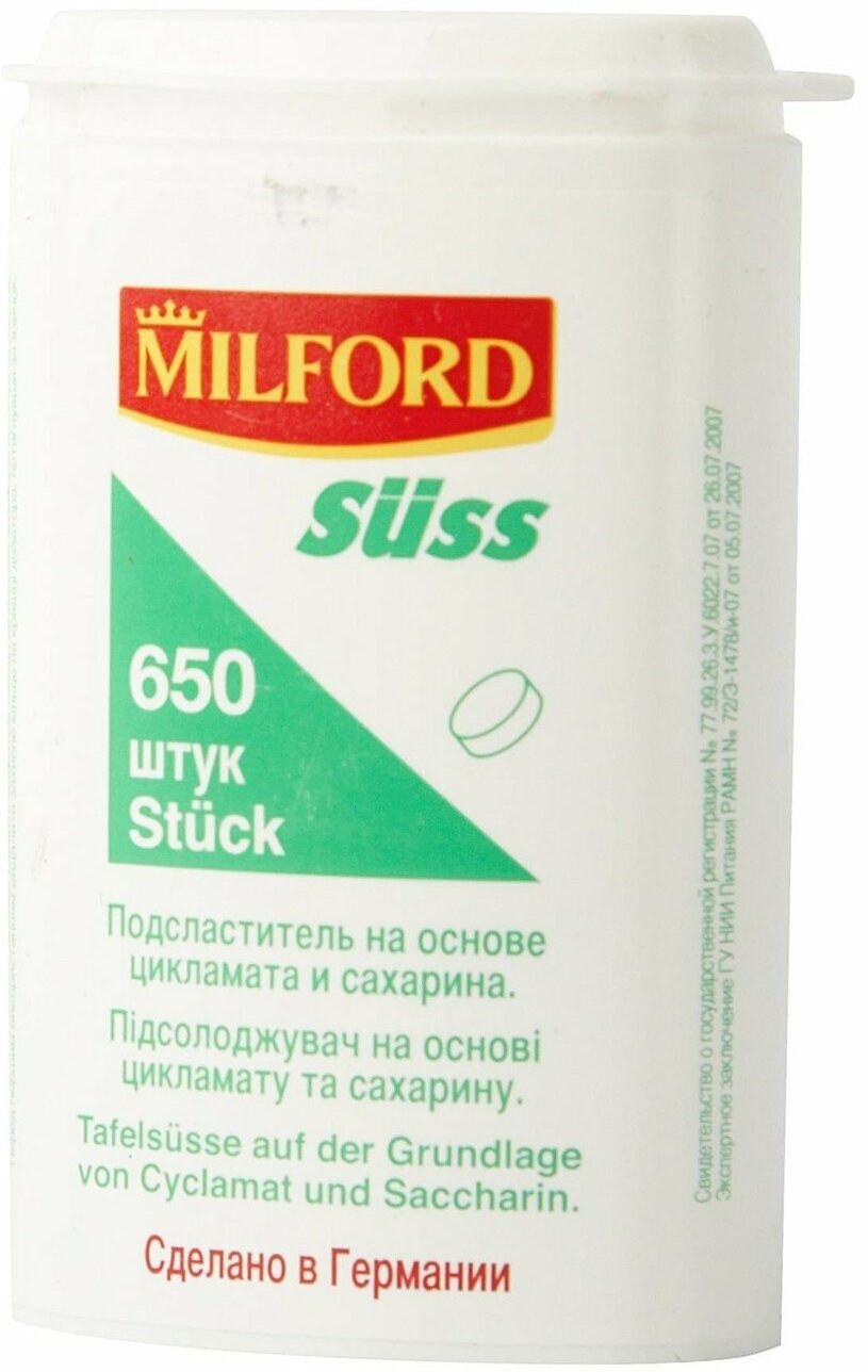 Лучшие цены. Подсластитель Milford, 650 табл. Сегодня подсластители Milford Suss - это лидеры рынка сахарозаменителей. Продукт производится в Германии при постоянном контроле качества. Все производственные процессы соответствуют предписаниям европейского законодательства и отвечают стандартам в области продуктов питания. Milford Suss - продукт с приятным вкусом, максимально приближенным ко вкусу сахара. Магазины в вашем городе.