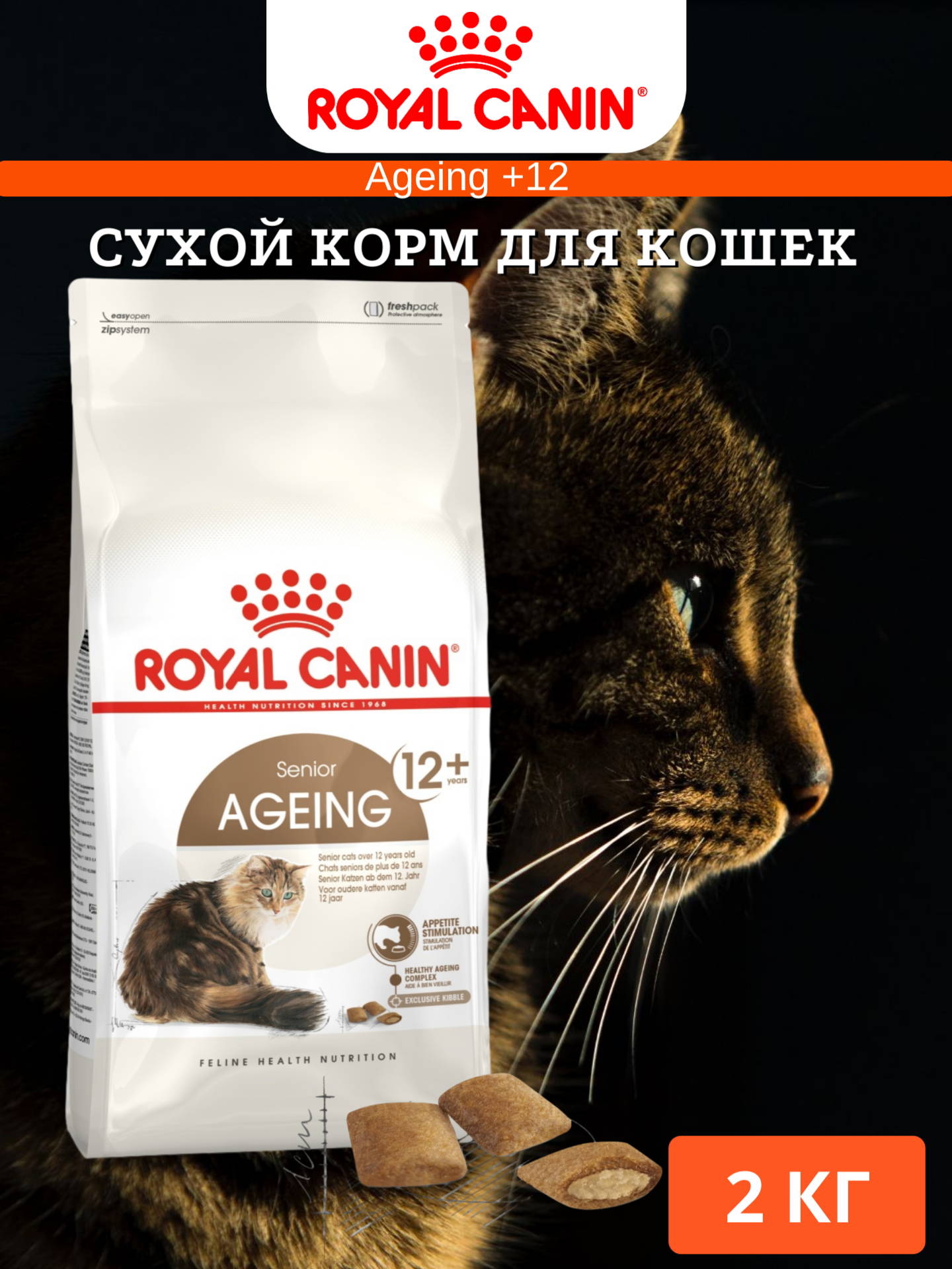 Лучшие цены. С началом старения диетологические потребности кошек изменяются. Важно помнить об этих изменениях и вовремя подобрать новый рацион. Продукт ROYAL CANIN® Senior Ageing 12+ предназначен для кошек старше 12 лет и разработан с учетом их особенностей. Двойная текстура крокет (хрустящие подушечки с мягким наполнением) стимулируют аппетит, а запатентованный комплекс антиоксидантов поддерживает здоровье кошек в период старения. Магазины в вашем городе.