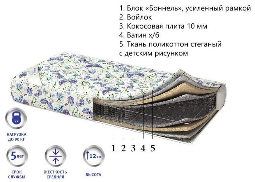 Лучшие цены. Детский матрас Corretto Noce di cocco обладает жёсткостью чуть выше среднего уровня. Он обеспечен ортопедическим натуральным наполнителем и качественным блоком пружин «Боннель». Вместе они создают умеренную поддержку для спины ребёнка и гарантируют комфортные условия для сна. Наполнители: Кокосовая койра симметрично установлена сразу с двух сторон матраса. Это прекрасный дышащий наполнитель природного происхождения. Магазины в вашем городе.
