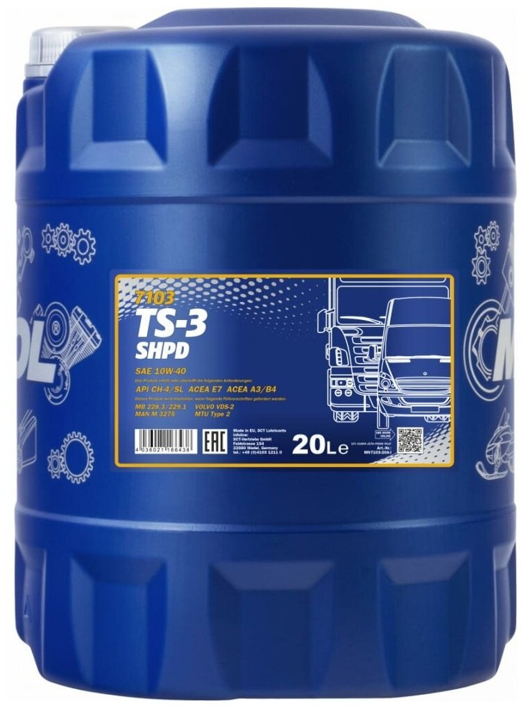 Моторные масла Масло Моторное Mannol Ts-3 Shpd Мин. 10W40 20Л (Ch-4/Cg-4/Cf-4/Sl; E3/A3/B3) MANNOL арт. MN7103-20