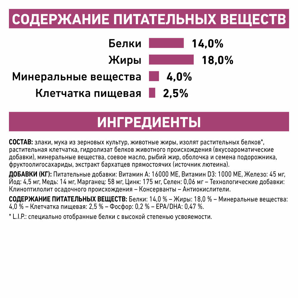 | Ингредиенты | мясо и мясные субпродукты, злаки, масла и жиры, минералы, углеводы |