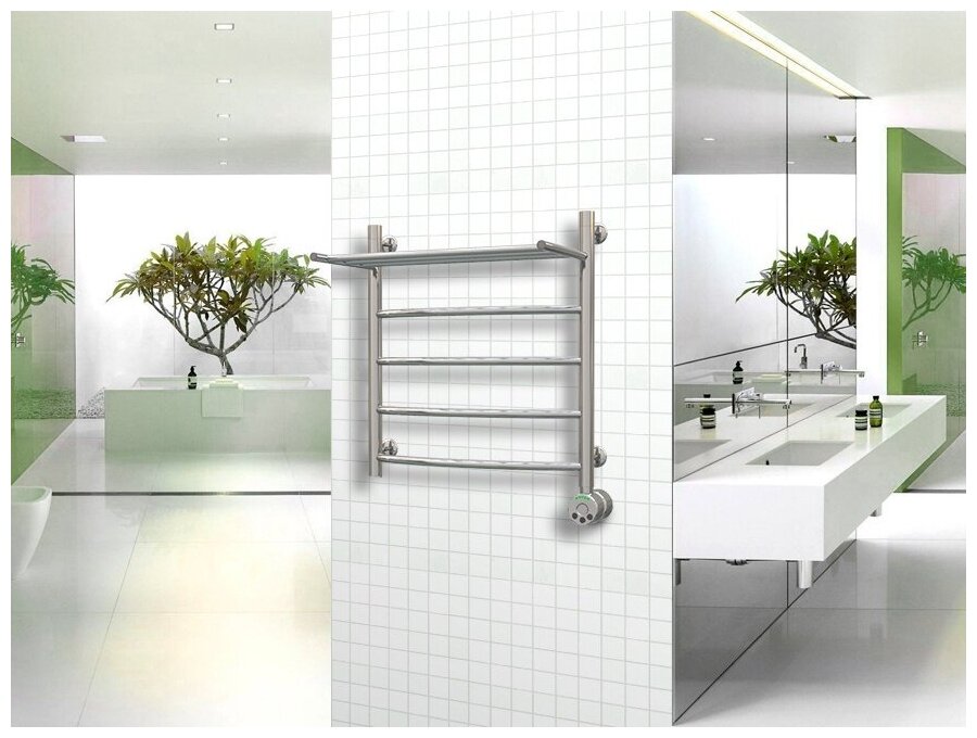 Лучшие цены. Электрический полотенцесушитель Aquanerzh Дуга 05-02A6050_R с полкой. Характеристики: - Цвет: хром. - Материал: нержавеющая сталь. - Размеры (ШхВхГ): 50х60х27 см. - Форма: лесенка. - Количество перекладин: 7. - Подключение: правое. - Монтаж: подвесной. - С ТЭНом. - С полкой. В комплекте поставки: полотенцесушитель, тэн. Магазины в вашем городе.