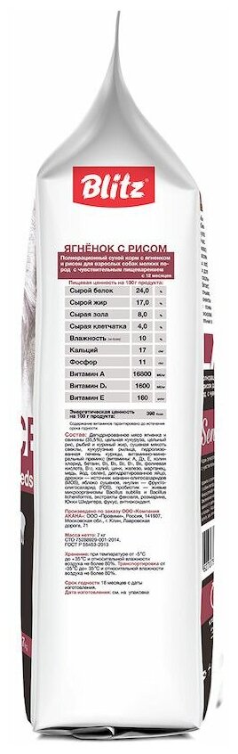 Корм для собак мелких пород BLITZ Adult Sensetive с ягненком и рисом, 1,8 кг 1 169 ₽ Подробнее