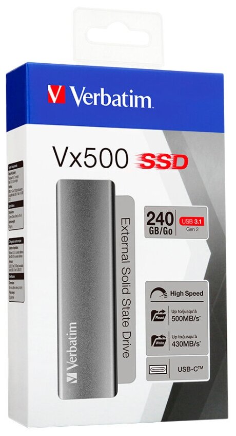 Лучшие цены. Внешний жесткий диск (HDD) Verbatim Vx500 с интерфейсом USB 3.1 Gen 2 емкостью 240 ГБ 47442 - описание: Технология хранения данных следующего поколения Во внешнем твердотельном накопителе Verbatim Vx500 используются высокоскоростная флэш-память и контроллер USB 3.1 Generation 2, что обеспечивает исключительно высокую производительность. Управляйте своими данными Хранение, перенос и резервное копирование больших объемов цифровых данных занимает много времени и является непростой задачей. Магазины в вашем городе.