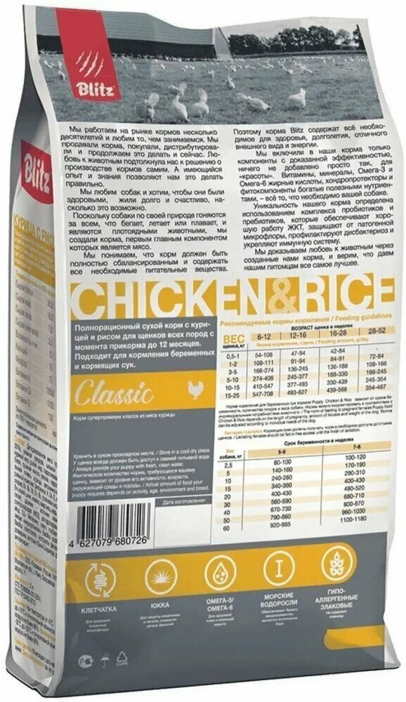 Лучшие цены. Blitz Classic Chicken & Rice Puppy All Breeds Полнорационный сухой корм для щенков Blitz Puppy Chicken можно назвать универсальным: он рассчитан на малышей и юниоров всех пород и размеров (до 12 мес.). Прикорм щенков можно начинать с 3-4 недель, предварительно размочив корм тёплой водой за 30 минут до кормления. С 1,5 месяцев рекомендуем полный переход на корм. Питательный рацион на основе мяса цыплёнка обеспечит любимца всеми необходимыми элементами, столь необходимыми для роста, игр и полноценного. Магазины в вашем городе.