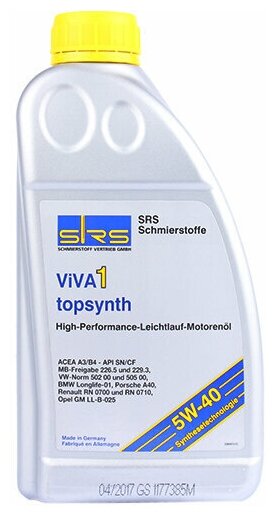 Масло моторное SRS VIVA 1 topsynth 5W40 синтетика, 4 литра 7382