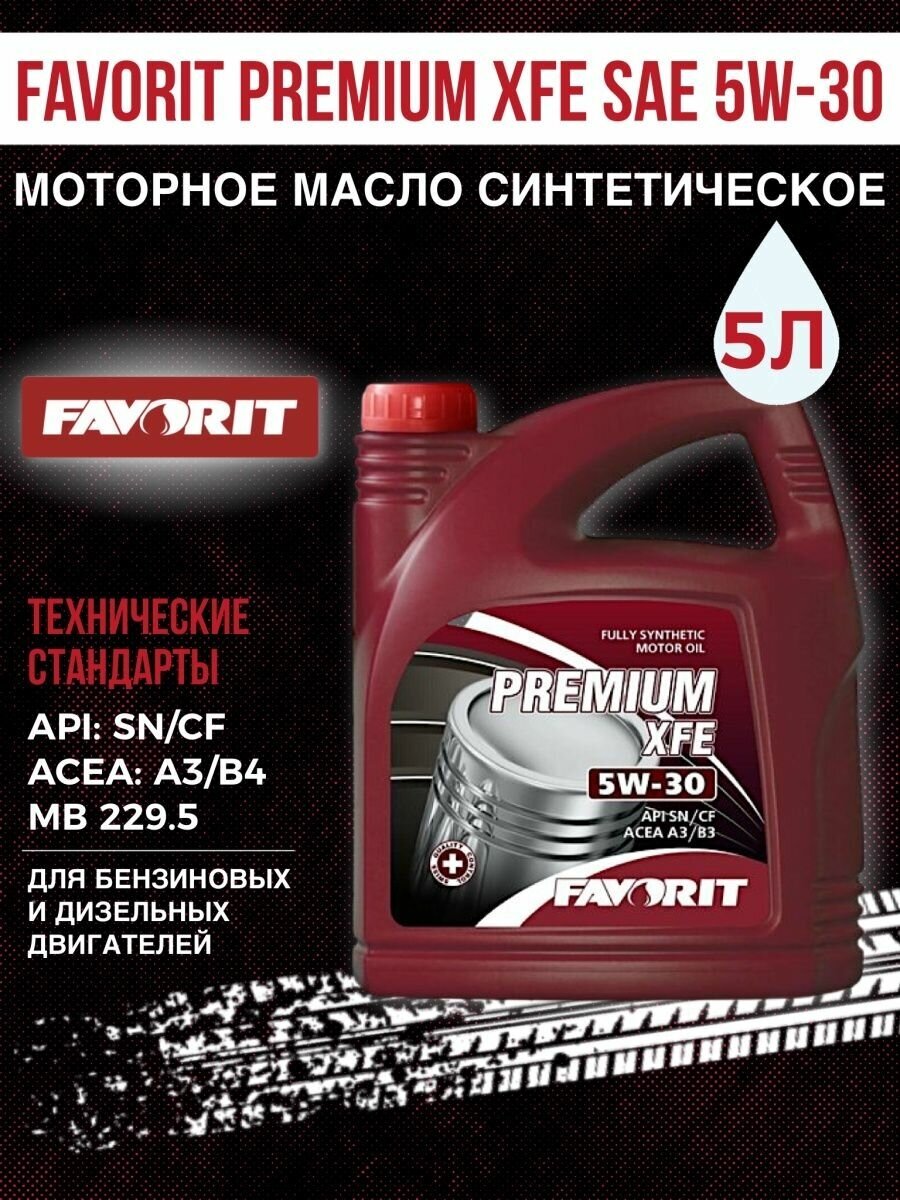 Лучшие цены. Моторное масло синтетическое Favorit Premium XFE 5W-30 API SN/CF 5л - всесезонное синтетическое моторное масло, предназначенное для использования в бензиновых и дизельных двигателях автомобилей. Современных пакет присадок гарантирует прочную смазочную пленку в самых жестких условиях эксплуатации. Обеспечивает легкий пуск двигателя автомобиля при низких температурах. Обладает оптимальной вязкостью в широком диапазоне температур. Эффективно защищает от износа и нагарообразования. Магазины в вашем городе.