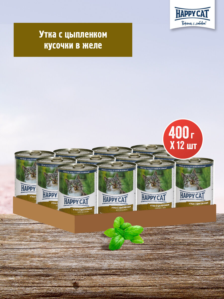 Happy Cat Корм полнорационный консервированный для кошек Утка с Цыпленком Кусочки в желе, 400 г х 12 шт