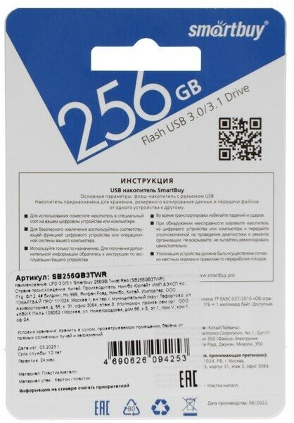 Лучшие цены. Флешка Smartbuy Twist, 256 Гб, USB 3.1, чт до 70 Мб/с, зап до 40 Мб/с, красная -Вес: 15 г. -Фасовка: 1 шт -Тип индивидуальной упаковки: Блистер -Длина упаковки: 12.5 -Высота упаковки: 1 -Ширина упаковки: 8.5 -Объем упаковки: 0.106 -Объем продукта: 0.0968 -Объем бокса: 1.936 -Материал: Металл, пластик -Гарантийный срок, мес: 12 -Температурное ограничение: Нет. Магазины в вашем городе.