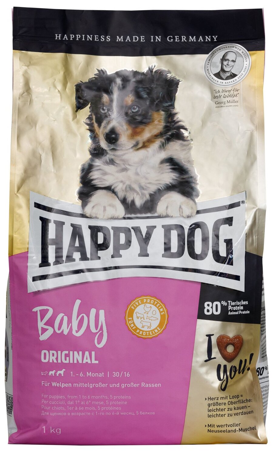 Лучшие цены. Полноценный корм для щенков в возрасте с 1-го месяца по 6-й месяц. Благодаря уникальной форме гранул подходит для щенков средних и крупных пород. Корм Happy Dog Baby Original для щенков в возрасте начиная с 4-й недели жизни обеспечивает сбалансированное питание и гарантирует оптимальное развитие. Крокеты уникальной формы в виде кольца усваиваются особенно легко. Этот прекрасно зарекомендовавший себя корм не содержит злаков. Магазины в вашем городе.