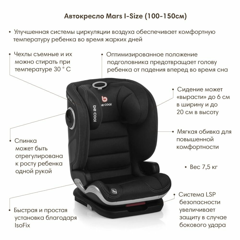 Лучшие цены. Автокресло Mars I-Size от бренда BE COOL – залог комфорта и спокойствия любой поездки с ребенком. Независимо от того, на какой машине вы ездите, если в ней есть ISOFIX, Be Cool Mars i-Size вамподойдет. Для надежной и стабильной установки детское сиденье крепится с помощью ремня безопасности вашего автомобиля и системы ISOFIX. Для установки поместите его на заднее сиденье вашего автомобиля, прикрепите детское сиденье к разъемам ISOFIX ; и пристегните ремень безопасности. Магазины в вашем городе.