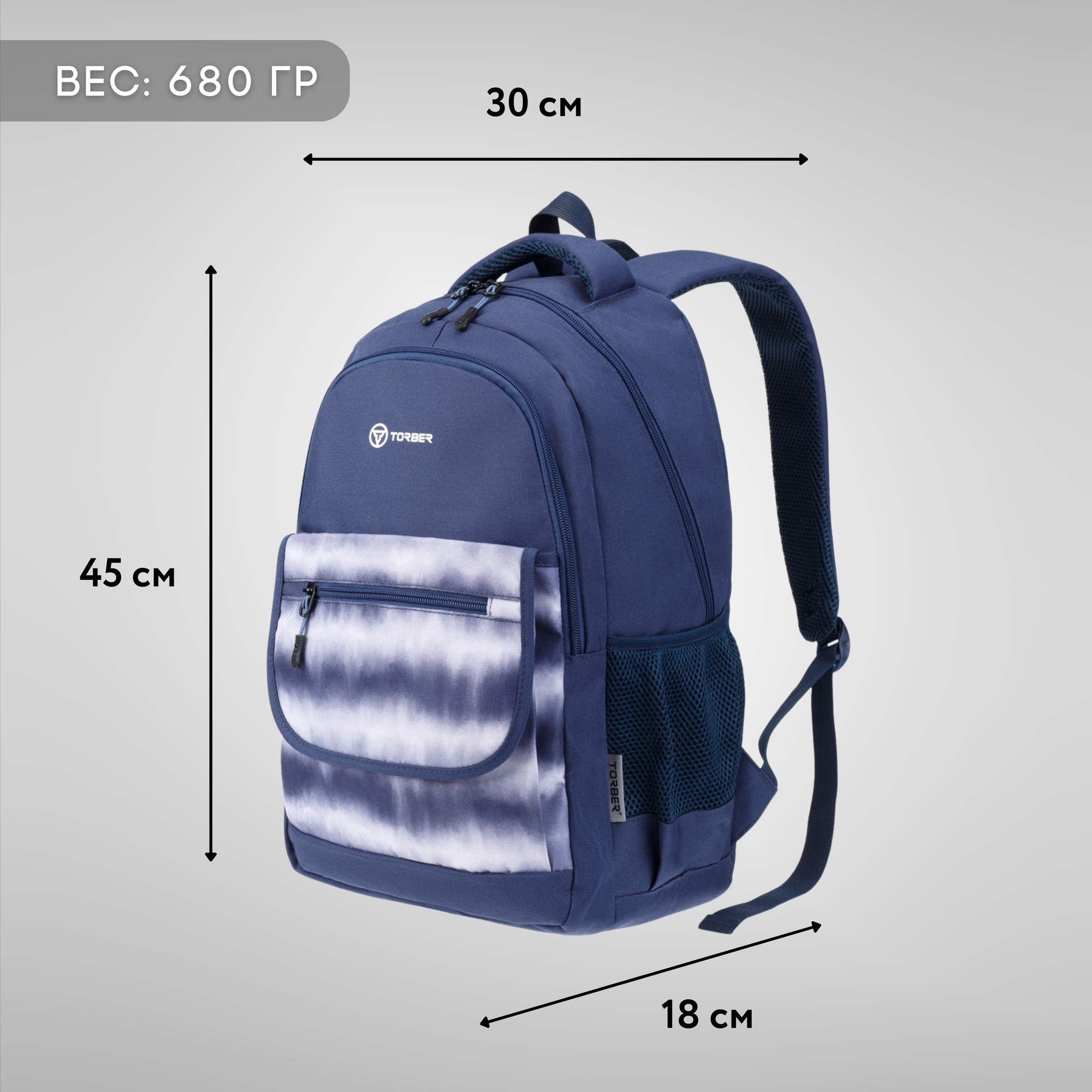 Школьный рюкзак TORBER CLASS X, темно-синий с орнаментом, полиэстер 900D, 45 x 30 x 18 см (T2743-22-DBLU)