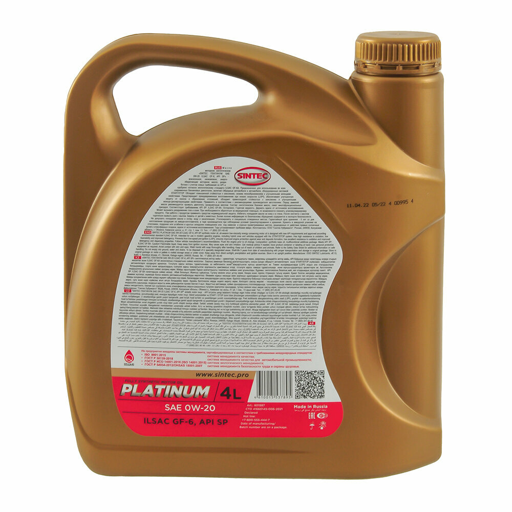 Синтетическое моторное масло SINTEC Platinum SAE 0W-20 ILSAC GF-6 API SP, 4 л, 3.578 кг, 1 шт