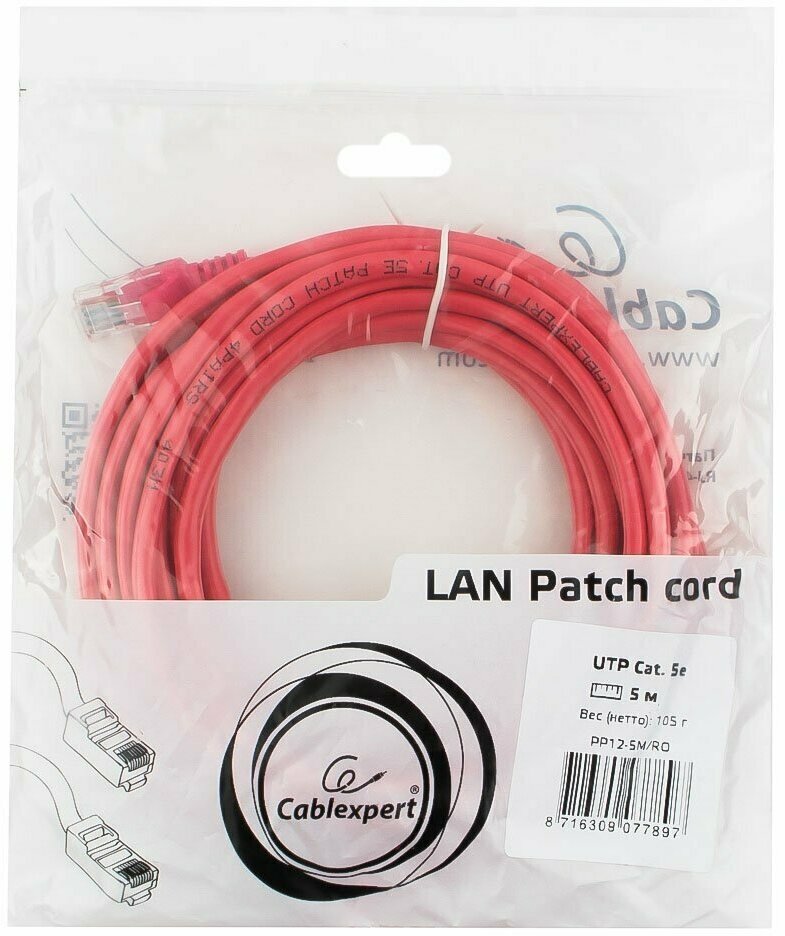 Патч-корд UTP Cablexpert PP12-5M/R категория 5e, 5 м, литой, многожильный, красный