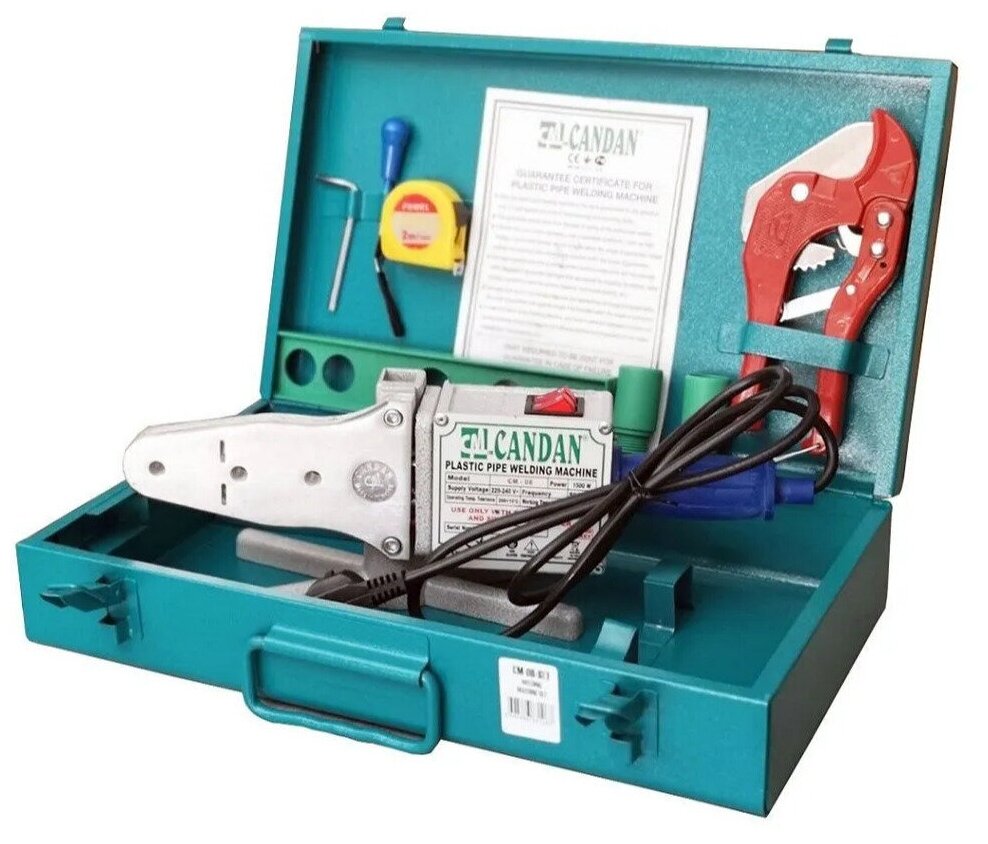 Лучшие цены. Комплект сварочного оборудования CANDAN CM-06 SET (1500Вт) Технические характеристики: Диаметры свариваемых труб: 16 - 50 мм; Мощность: 1500 Вт (двойной элемент 750+750 Вт Напряжение: 220-240 В; Частота: 50-60 Гц; Рабочая температура: 270С; Кабель: 3х1,5 мм;2 метра. огнеустойчив, выдерживает нагревание до 300 C; Нагреватель из нержавеющего материала с возможностью одновременной установки сразу трех нагревательных насадок; Индикатор регулировки термостата: 50 - 320С; Кабель питания: поперечное сечение. Магазины в вашем городе.