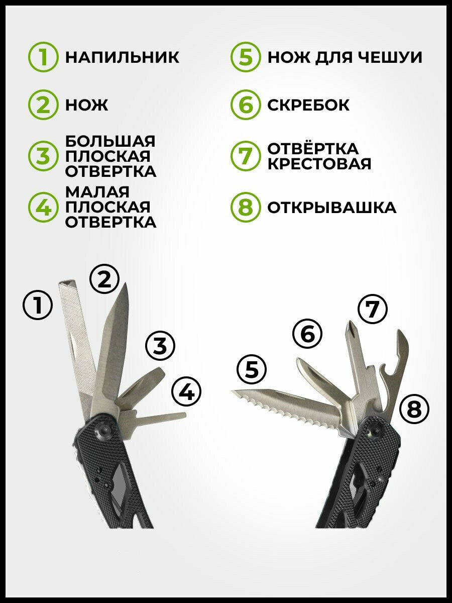 Лучшие цены. В конструкции мультитула предусмотрен весь набор необходимых инструментов для путешествий, комфортных прогулок, поездок на автомобиле, велосипеде, мотоцикле, в быту и на работе. Универсальный подарок для любимых и дорогих мужчин, которые любят активный образ жизни и что-то мастерить своими руками. Это многофункциональный инструмент, включающий в себя плоскогубцы, напильник, пару плоских отверток, одну крестовую отвертку, ножи, открывалку, скребок. Магазины в вашем городе.