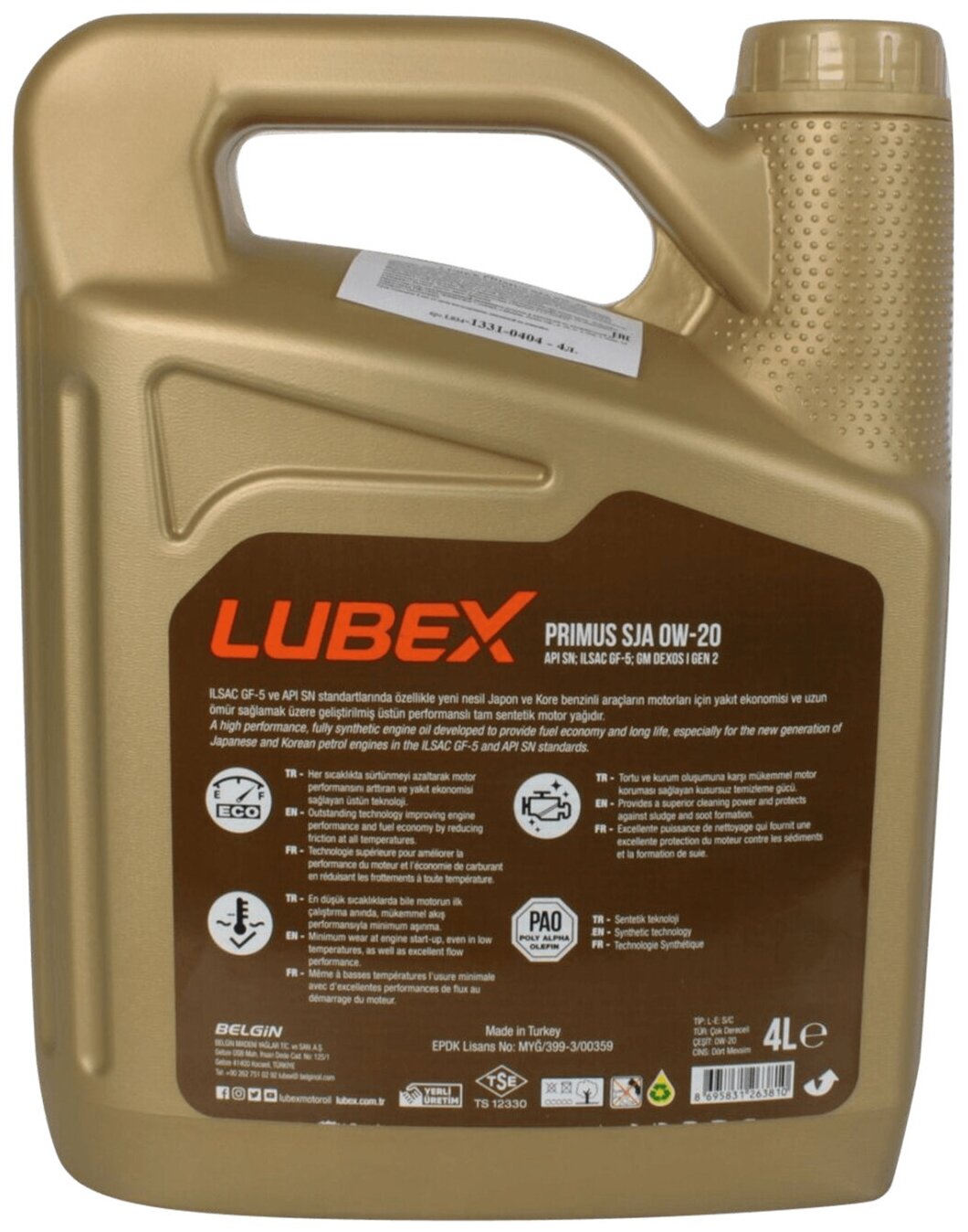LUBEX L03413310404 LUBEX PRIMUS SJA 0W20 (4L)_масло моторное! синт.\API SN+RC, ILSAC GF-5, GM dexos1 Gen 2 4 985 ₽ Подробнее