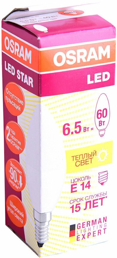 Лампа OSRAM LED Star E14 свеча B C37 6.5Вт, светодиодная LED, 550 лм, эквивалент 60Вт, тёплый свет 3000К