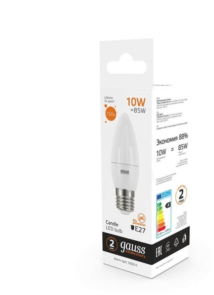 Лампа светодиодная Gauss 10 вт, цоколь е27, свеча, теплый белый, 25000 ч, b37-10w-3000-e27 (30210)