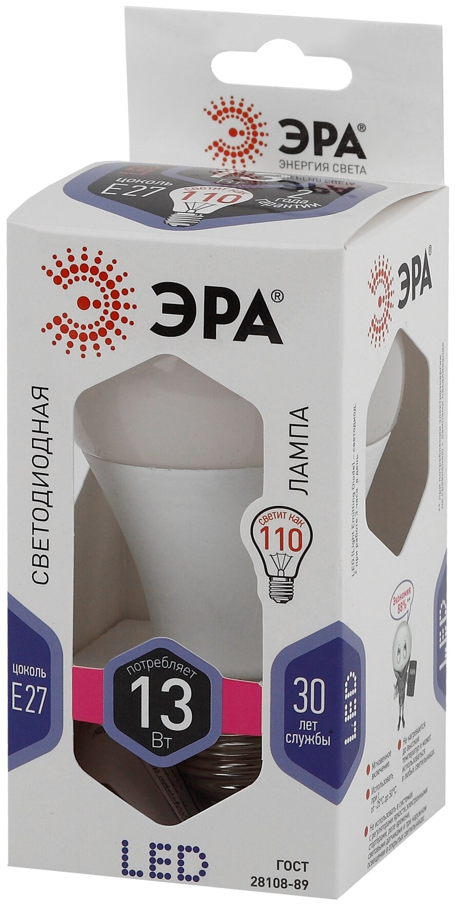 Лучшие цены. Лампа светодиодная ЭРА LED A60-13W-860-E27 13Вт Е27 6000К Б0031395 Светодиодная лампа классической формы груши ЭРА (матовая), излучает холодный белый свет, с цоколем E27, мощность 13 Вт. Современный, качественный и доступный источник света. Создает яркое ровное освещение и экономит до 90% электроэнергии по сравнению с лампой накаливания с аналогичным световым потоком. Модель LED A60-13W-860-E27. Магазины в вашем городе.