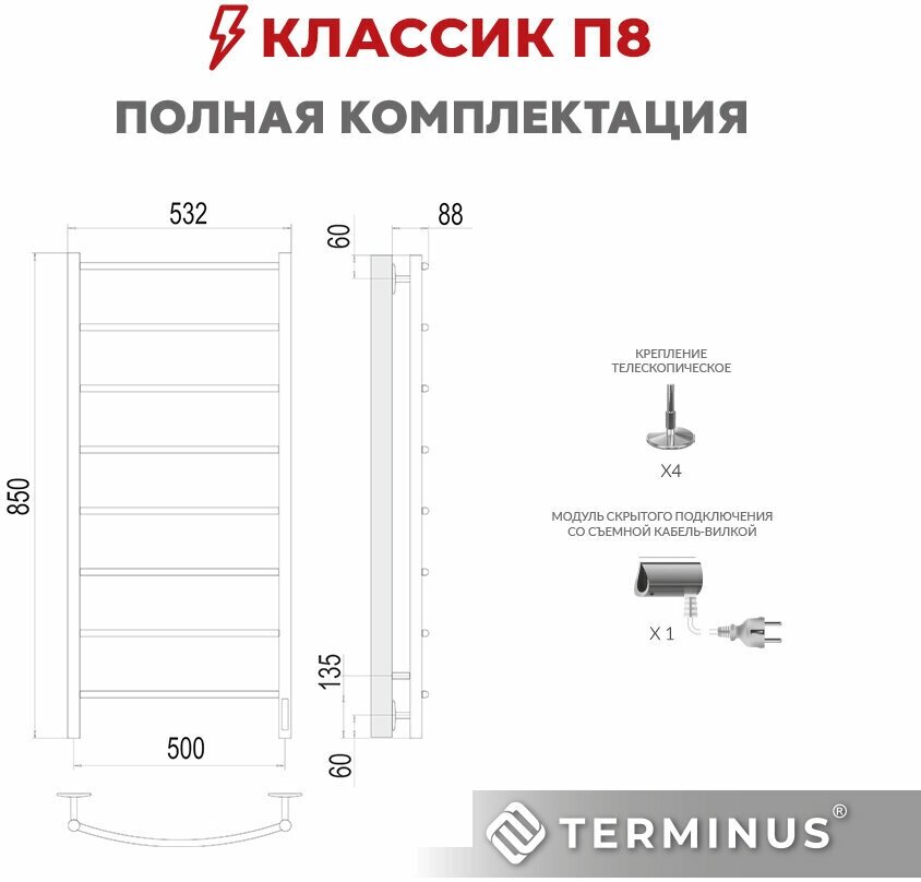 Полотенцесушитель электрический TERMINUS(Терминус) Классик П8 500х850 мм, сверхпрочная нержавеющая сталь, диммер Quick Touch, гарантия 5 лет/ Электрический полотенцесушитель с терморегулятором